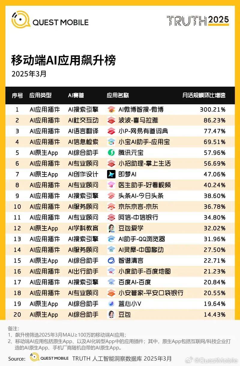 在引入DeepSeek R1後,微博智搜在站內地位得到了肉眼可見的提升,根據QuestMobile發佈的《2025 全域AI應用市場報告》顯示,僅是3月,微博智搜的月活就環比增長了300%,成為了國內增速最快的AI應用插件。