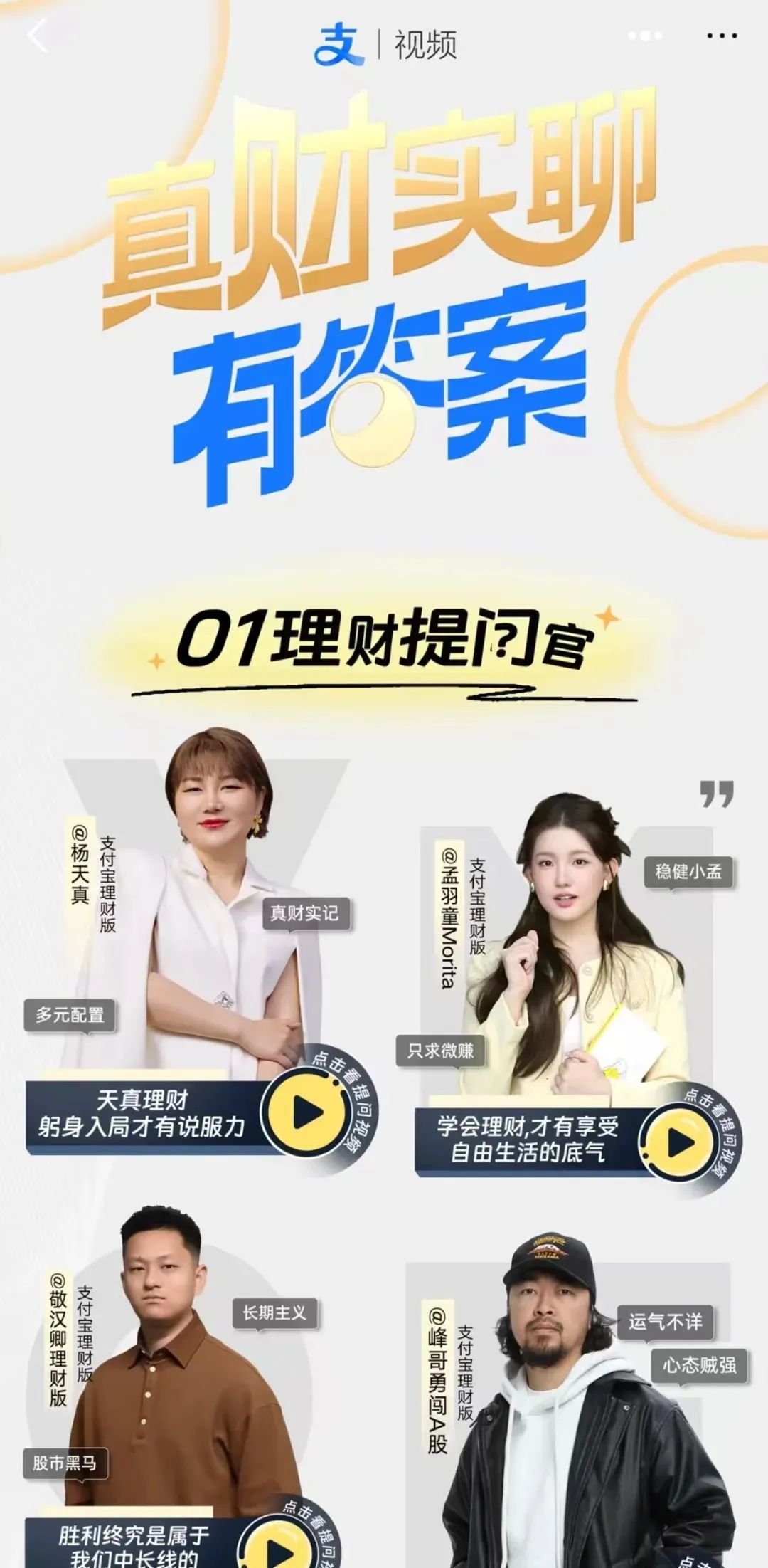 穩健求財的孟羽童,相信長期主義的敬漢卿,運氣不詳、心態賊強的峯哥,這些支付寶上的優秀創作者都在從不同角度分享自己的經驗。當然理財沒有標準答案,每一種理財方式本質都是在選擇自己的生活方式。如果你也有相關的疑惑,也可以上支付寶搜“理財答案”,去看到更多嘉賓的觀點。