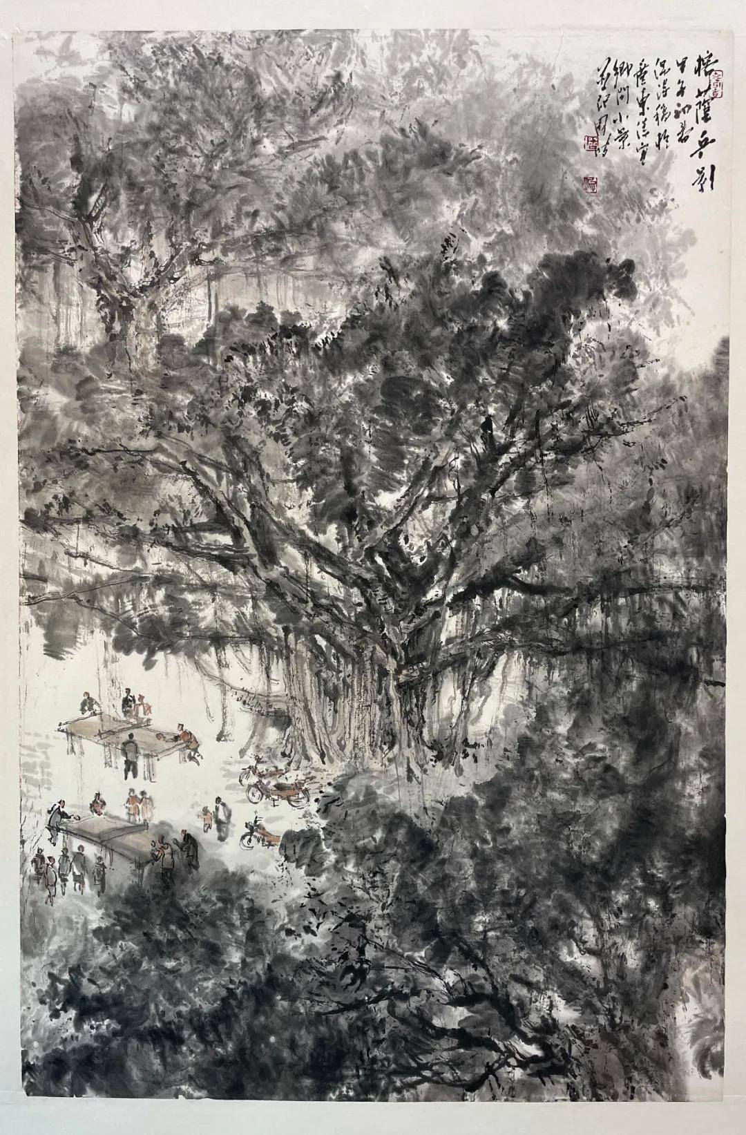 《榕蔭乒影》 周波 68cmx46cm 中國畫