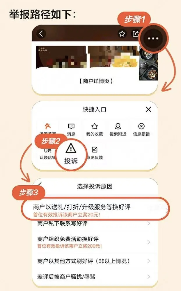 除此之外,在此次欄目改版升級前,美團還針對消費者吃飯時被要好評、寫真實差評吐槽被騷擾的問題,推出了全民監督機制,開啓一鍵投訴功能。
