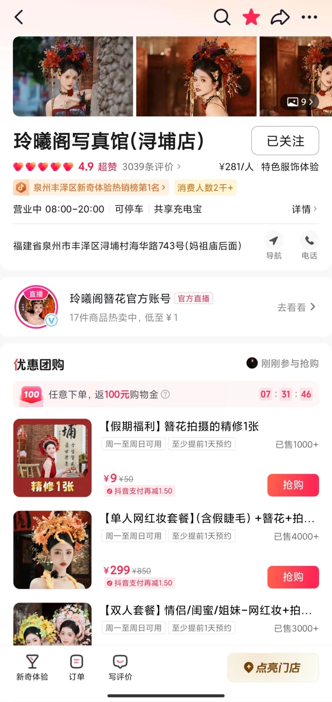 土生土長的泉州人曉玲,就是在2023年底開出了玲曦閣簪花館首店。因為她從2019年就開始做抖音主播,所以開業初期就入駐了抖音生活服務,曉玲每天最主要工作就是直播簪花和拍攝精美變裝短視頻。她在店鋪簡介中寫到“我們有專業的場地,有眼光有手法的化妝師,有能力高出片的攝影師,上千套好看的服飾。”