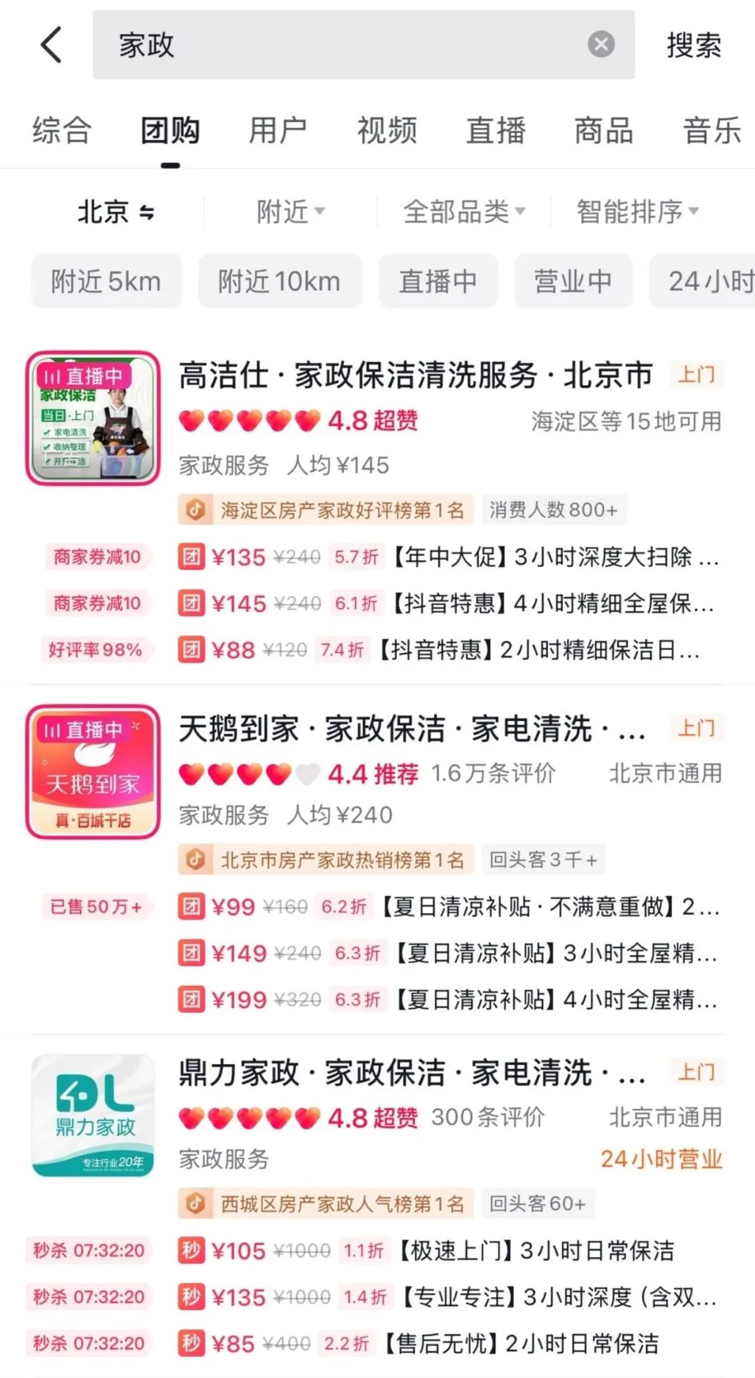 但在抖音生活服務平台上,推薦機制+視頻呈現,改變了家政服務企業的經營邏輯:用户平時就能刷到保潔人員認真負責的清潔視頻或直播,形成內容種草;通過視頻,用户可以直接選購保潔服務的類型,預約服務時間;家政服務結束後,客户能在平台反饋真實體驗和服務照片,為接下來的消費者提供參考。