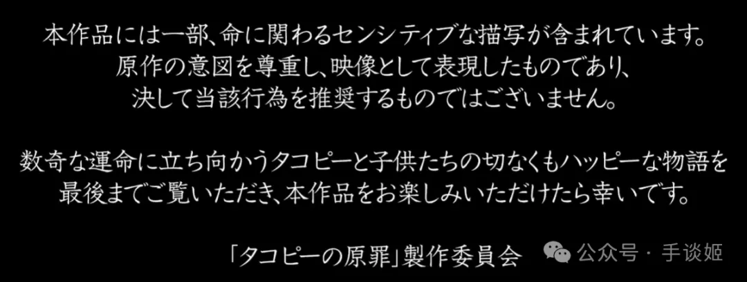 “本作品描寫了一些和生命有關的敏感話題,在尊重原作的情況下以影像形式進行表現,絕不代表推崇此等行為。這是章魚噼和孩子們勇敢面對坎坷命運的悲喜故事,請大家看到最後。”