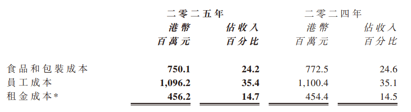 報告期內,除了租金成本外,大快活集團的食品和包裝成本以及員工成本都有一定的下降。具體來看,食品和包裝成本從上年的7.73億港元降至7.50億港元,員工成本則降低了400萬港元左右。