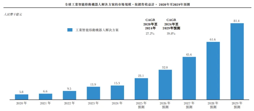 據招股書,2020年至2024年,全球工業智能移動機器人解決方案的市場規模從58億元增長至153億元,複合年增長率為27.2%,預計2029年將進一步增長至814億元,2024年至2029年的複合年增長率為39.8%。