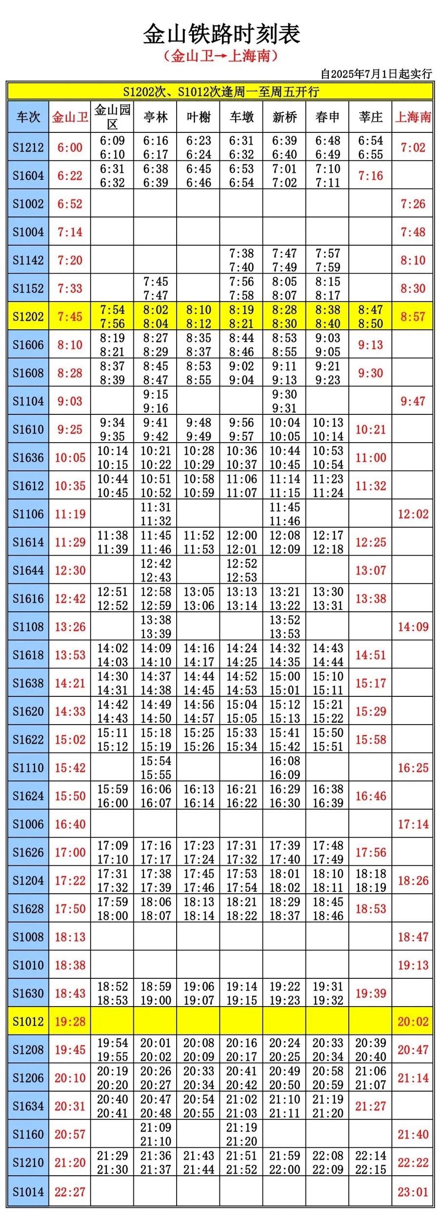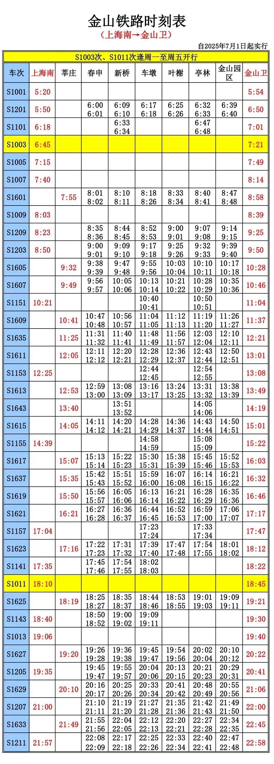 金山鐵路新時刻表。其中,早高峯時段S1209次始發地車站由莘莊站改為上海南站,晚高峯上海南站至金山衞站S1157列車的始發時間由原16時51分調整為17時04分。此外金山鐵路還增開一趟晚間21時57分上海南站至金山衞站的S1211次列車。鐵路出行越來越便捷和高效,必將帶動更多人流動起來,為經濟發展注入更多活力。據預測,鐵路上海站暑運期間(7月1日至8月31日)預計發送旅客2855萬人次,同比增長7.14%;長三角鐵路暑運期間預計發送旅客1.9億人次以上,同比增長6.7%。這兩項數據均將創歷史新高。綜合 | 上觀新聞、澎湃新聞、微博網友原標題:上海南站發出最後一班綠皮火車!確認了:今起有大變化,上海到多地用時明顯壓縮,金山鐵路也調整→來源:新聞晨報