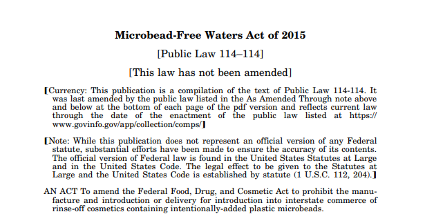 2015年美國通過《無微珠水域法案》(Microbead-Free Waters Act),該項法案禁止生產和營銷人為添加塑料微珠的沖洗型化妝品。從2017年7月1日起,個人護理品廠商不得再生產含有塑料微珠的洗面奶、洗髮水和牙膏等,2018年7月1日起全面禁止銷售。
