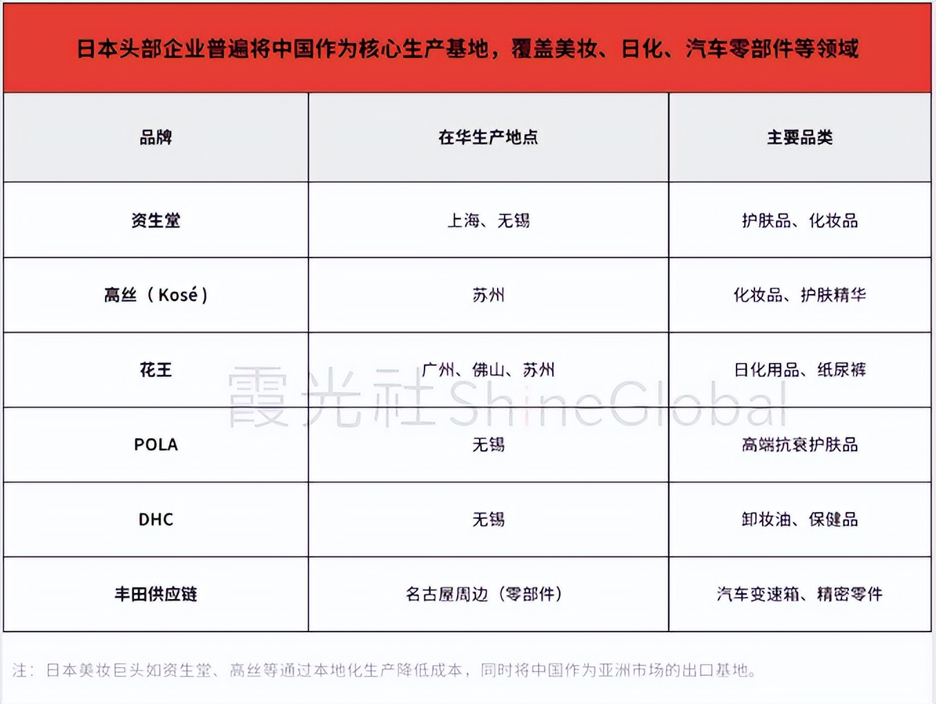 首先看優勢。其一,是**中國供應鏈積累多年的世界級優勢。**如果我們將目光放在日本多個不同行業頭部企業的供應鏈,不難發現,中國市場一直是日本頭部企業的核心生產基地。也就是説,日本產品和中國產品的供應鏈上,幾乎不存在差異。