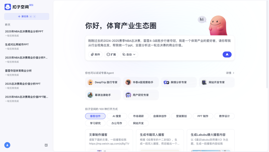 而除了體育賽事分析,用户還可以通過它生成商業報告、寫作靈感、行業洞察等多種風格內容,支持搜索、提問、寫作等,以下PPT便都是由釦子空間輸入一句話任務一鍵完成。