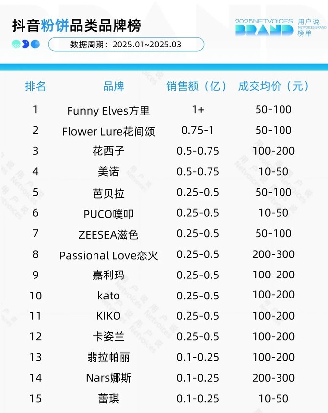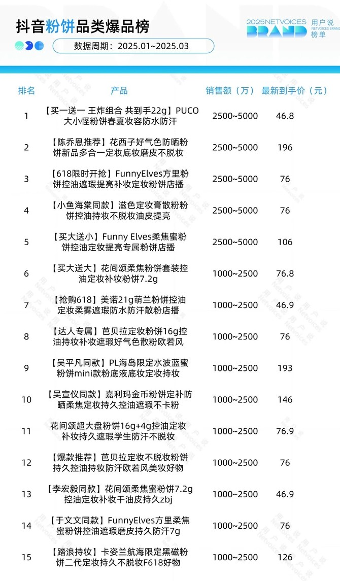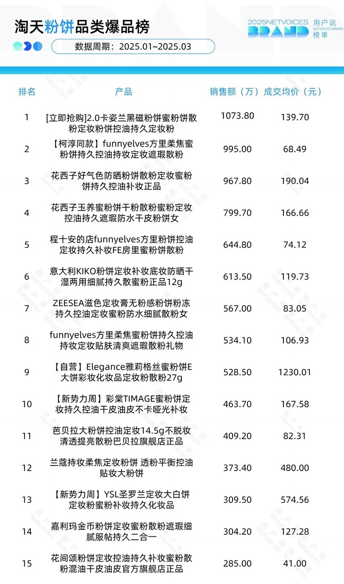 用户説將從淘天和抖音粉餅品類品牌榜與品類爆品榜出發,解讀2025年1月至2025年3月粉餅品類的品牌佈局與熱賣趨勢。