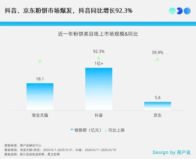 用户説監測發現,近一年抖音、京東粉餅市場爆發,抖音不僅以超淘天(18.1億元)的市場規模強勢領跑,更以92.3%的驚人同比增速一騎絕塵。京東雖以5.6億元的市場規模暫居第三,但其59.9%的穩健增長展現出強勁的追趕勢頭。