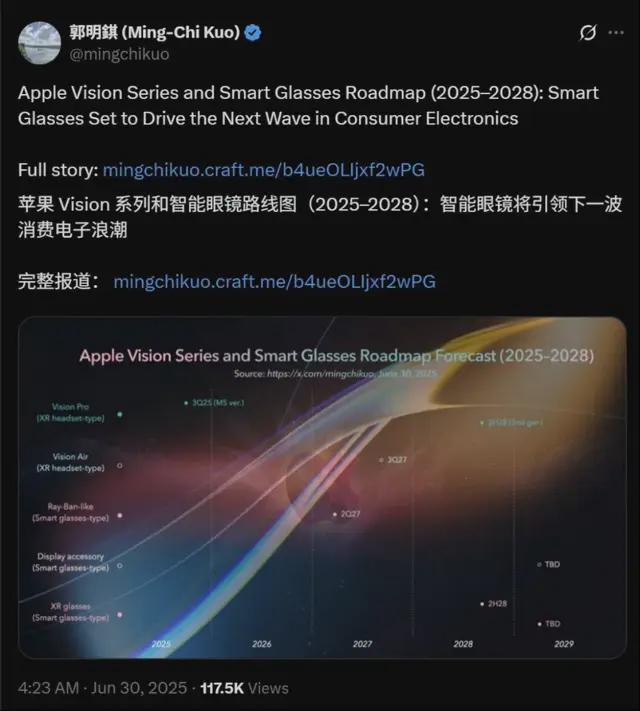 最近,果鏈知名分析師郭明錤發表了一份分析報告,首次完整披露了蘋果Vision 系列及智能眼鏡產品線(2025-2028 年)的戰略佈局。