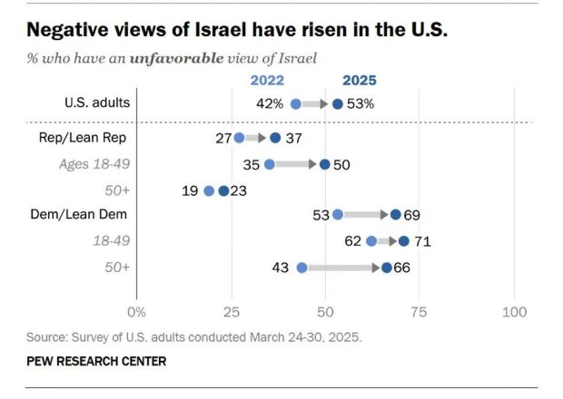 皮尤研究中心三月調查顯示美國人對以色列的負面看法上升率