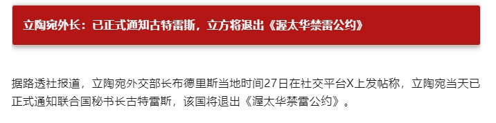 而就在此前兩天,波羅的海三國立陶宛、拉脱維亞和愛沙尼亞也分別向聯合國提交退出《渥太華禁雷公約》的文件,按照公約規定,三個國家將在6個月後正式退出。另據報道,芬蘭和波蘭也已啓動退出這一公約的程序。