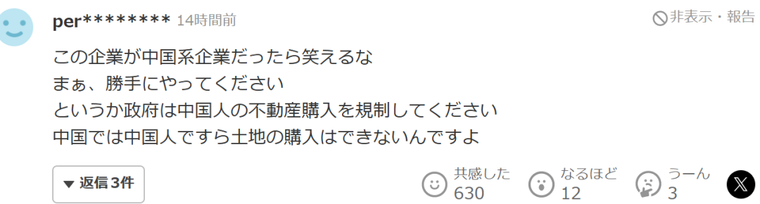 對此,日本網友抱着看熱鬧的心理表示,外國人就沒有資格買日本的土地。