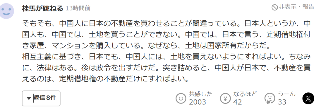 “從根本上説,允許中國人購買日本不動產就是個錯誤。不僅日本人,事實上中國人在中國本土也無法購買土地所有權。在中國,人們購買的只是相當於日本的"定期借地權"住宅和公寓,因為土地完全屬於國家所有。