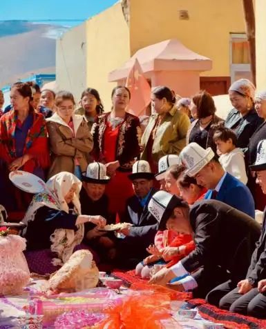 在柯爾克孜族婚禮上,新人共掰圓饢寓意着美滿,表達對愛情的忠誠和白頭到老的決心。