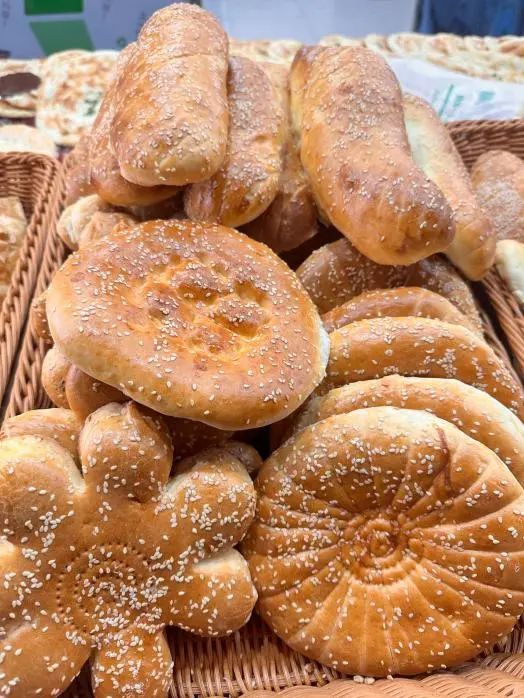 剛出爐的饢邊,薄脆如蟬翼,中央花紋處則保留着軟韌口感,芝麻在熱氣中噼啪作響,麥香混合着果木香直往鼻腔裏鑽。