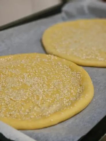 小麥粉為基底,加入雞蛋、清油、牛奶和洋葱末,再撒上星星點點的芝麻。