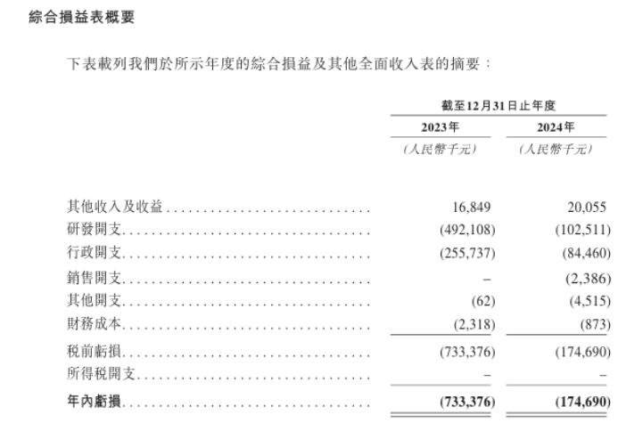 同時,公司行政開支分別為2.56億元、8446萬元。報告期內,公司尚未從產品銷售中產生任何收入。於2023年及2024年,虧損分別為7.33億元及1.75億元,絕大部分的經營虧損乃由往績記錄期間的研發開支及行政開支所致。