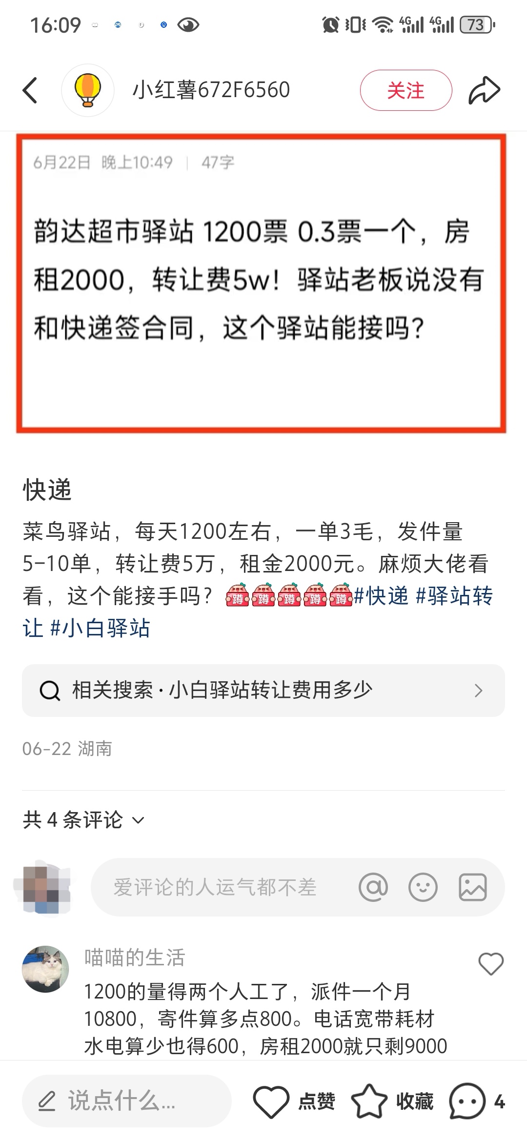 以一個想轉讓的快遞網點為例,一天1200票,0.3元一票。有網友算了一筆賬,1200票一般需要兩個人,一個月可得10800元,寄件按多的800元算,扣除水電、房租,全年無休的每天干十來個小時,一個月也只能分四五千。