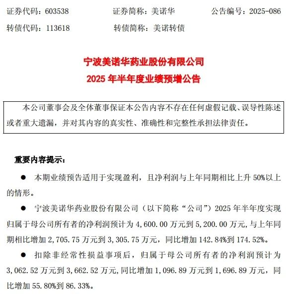 實際上,美諾華3日上午股價強勢表現,與其2日晚間發佈的《2025 年半年度業績預增公告》密不可分。