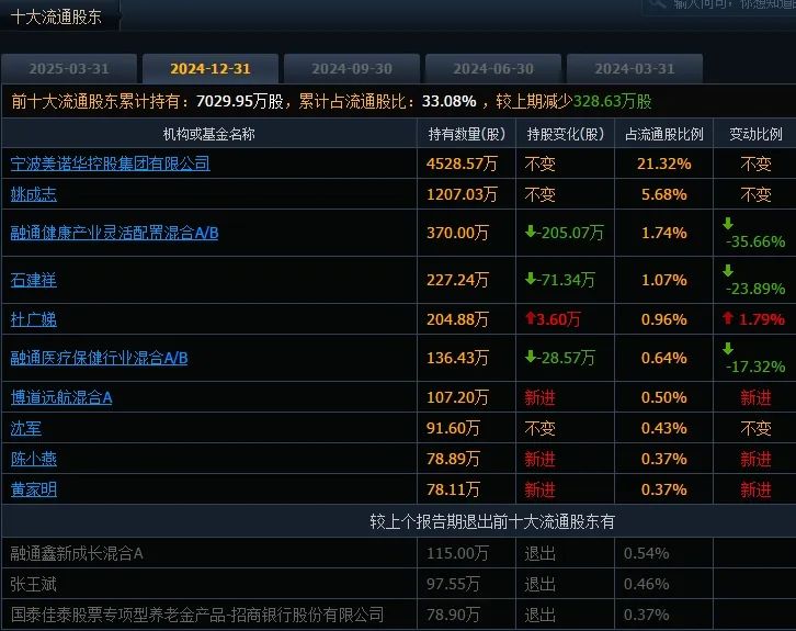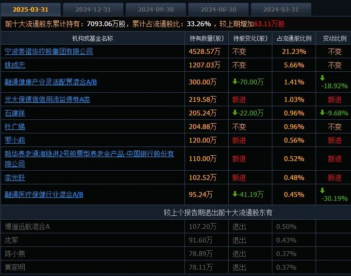 此外,從前十大流通股股東看,截至2025年3月末,其中,有四家新進,分別為光大保德信信用添益債券型證券投資基金、新華養老通海穩進2號股票型養老金產品、羅小莉、李光軒,有三個股東持減,分別為融通健康產業靈活配置混合型證券投資基金、融通醫療保健行業混合型證券投資基金、石建祥。