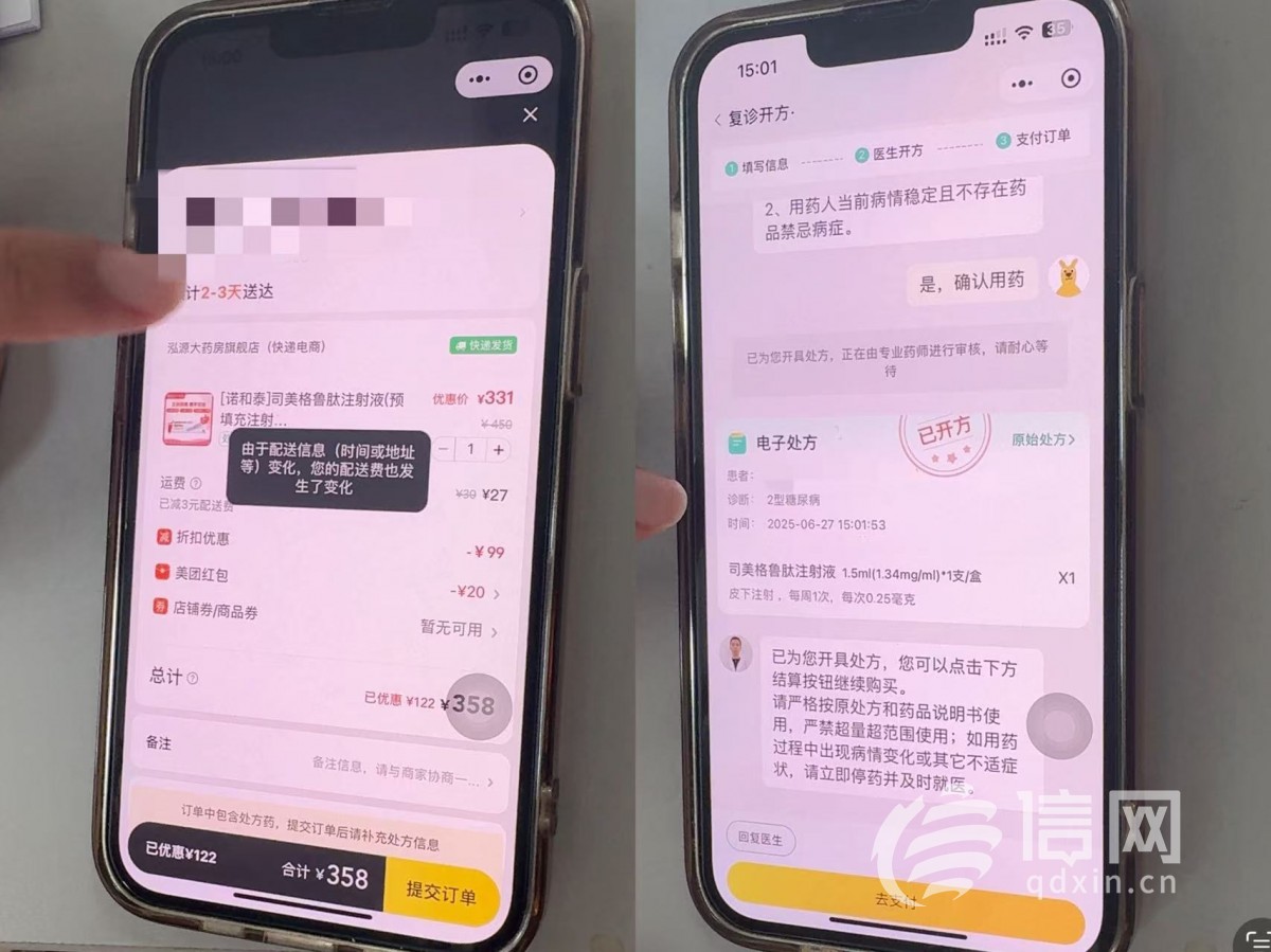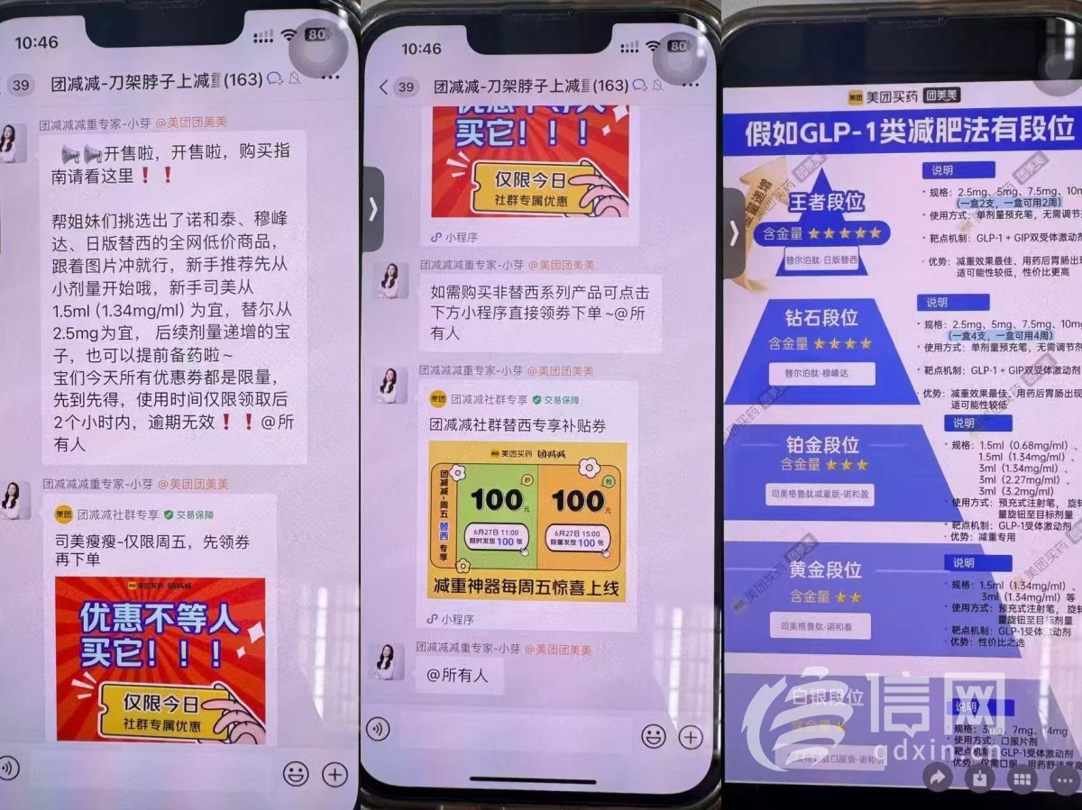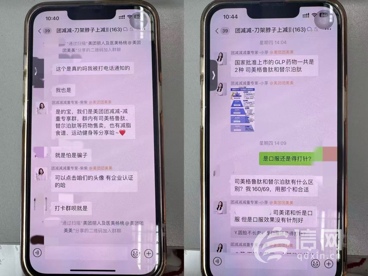羣內“認證專家”分享減肥藥(來源:受訪者)信網7月3日訊 當“全民減重”成為社會熱潮,司美格魯肽等處方藥被捧為“減肥神藥”。近日,青島市民劉女士向信網(熱線0532-80889431)反映,她接到一通自稱美團工作人員的電話,被拉入“萬人減重羣”後,發現這個所謂的“減重羣”實際上是減肥藥的“賣藥羣”,通過羣裏的鏈接就能直接買到需要憑醫囑才能購買的處方藥。信網嘗試發現,羣內“認證專家”分享的司美格魯肽注射液可在標有“美團外賣”的小程序中,填寫電子處方單,審核直接購買,全程僅需兩分鐘。但實際上,這種藥品本身是降血糖的藥物,而非減肥藥,需要經過嚴格的醫學檢查後才能確定能否使用。