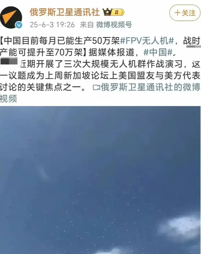 根據俄羅斯媒體的説法,中國目前已經能每月生產高達50萬架FPV自殺式無人機,戰時可以把產能提升至70萬架。