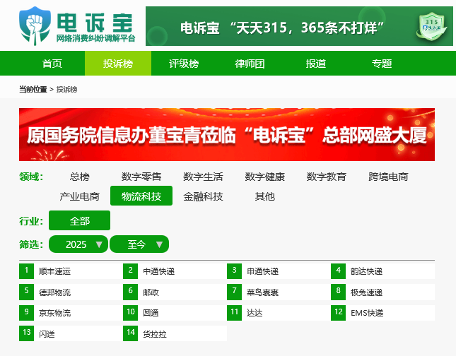 據國內知名網絡消費糾紛調解平台網經社“電訴寶”2025年至今受理的中國物流科技領域用户有效投訴顯示,入選投訴榜的依次為:順豐速運、中通快遞、申通快遞、韻達快遞、德邦快遞、郵政、菜鳥裹裹、極兔速遞、京東物流、圓通、達達、EMS快遞、閃送、貨拉拉。