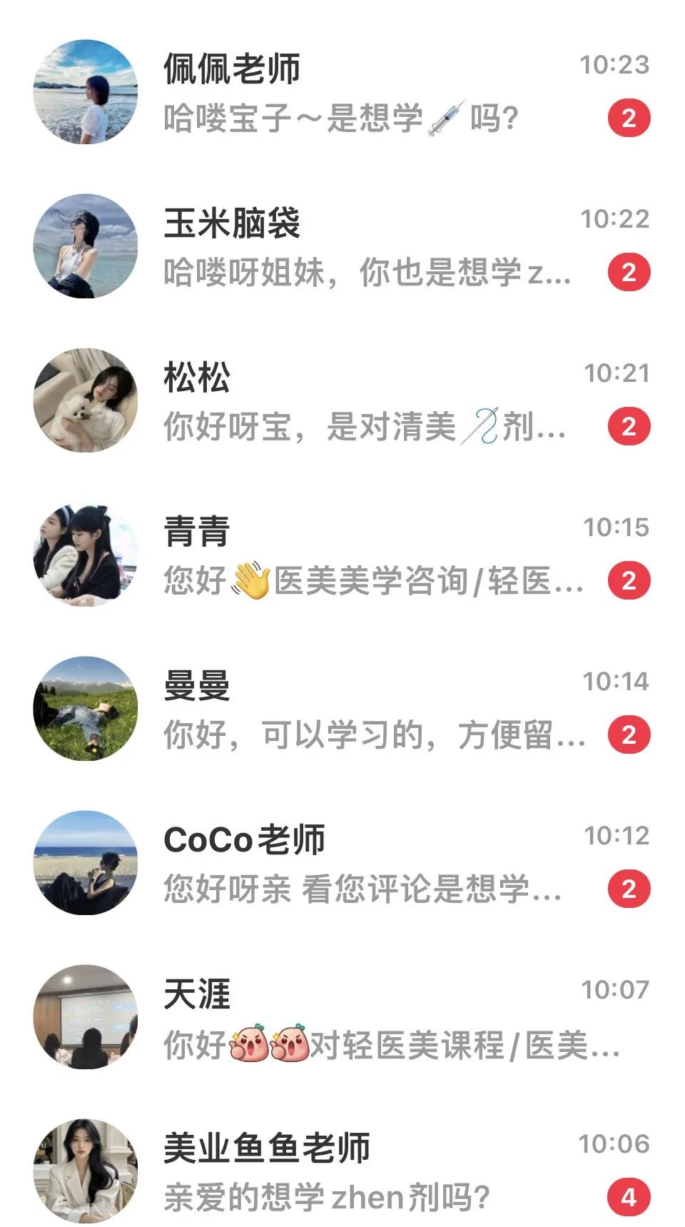 一直對各類醫美很感興趣的小葵(化名),在小紅書一篇筆記下表達了自己想學微整類課程後,私信裏瞬間湧入了10餘個介紹相關課程的從業者,分別來自廣州、上海等地的不同非法培訓機構。