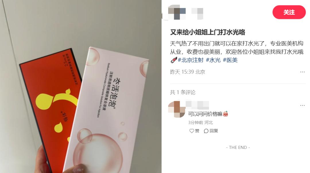 巨大的人才缺口,讓這些非法培訓機構和其學員看到了“商機”。“趣解商業”注意到,社媒平台上有不少所謂的“私人美容師”,會用上門服務的帖子或視頻來吸引用户,其提供的服務包括微針、水光針等醫美項目。