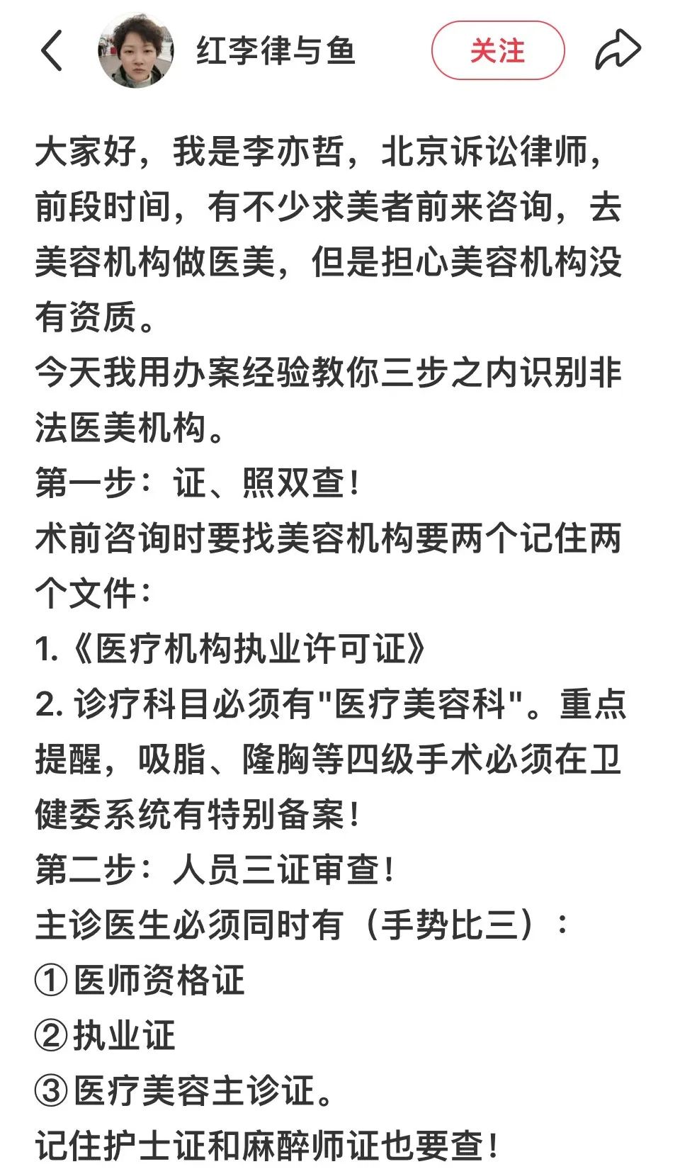 還有律師提到,普通消費者想要“避坑”,可以在術前諮詢時找美容機構和主診醫生索要證件,並仔細檢查美容機構在你身上使用的藥品,肉毒素、玻尿酸包裝必須帶“國藥準字”,遇到外文包裝可以要求出示海關證明和檢驗報告。