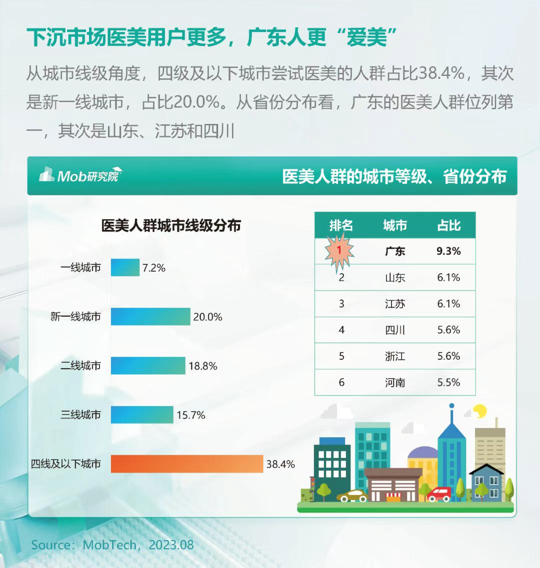 本就稀少的醫美醫生,還大多集中在一二線城市。根據“新氧數據顏究院”數據,中國前十大城市醫美醫生數量超過全國的50%。然而低線城市醫美消費的熱情並不低,MobTech數據顯示,2023年四級及以下城市嘗試醫美的人羣佔比最高,為38.4%,遠高於一線城市。這也意味着,下沉市場的消費者想找到靠譜的醫生,難上加難。