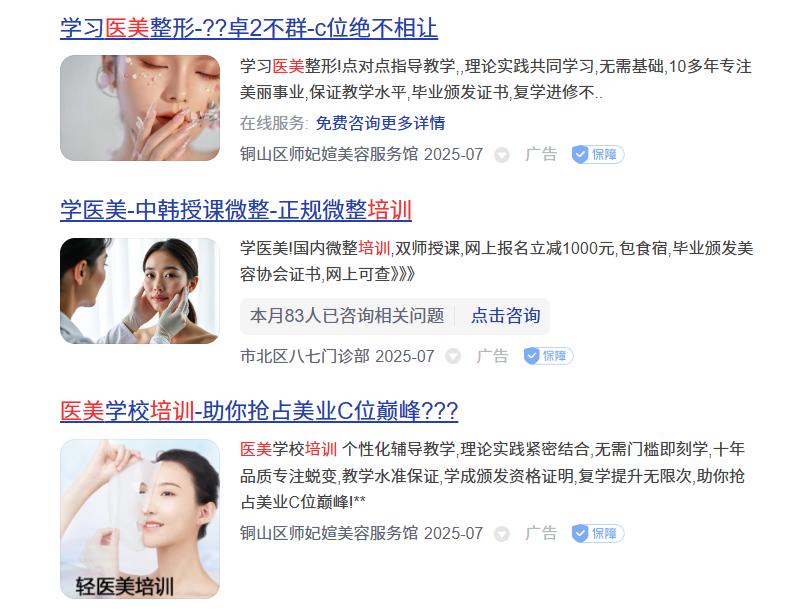在搜索引擎或社媒平台上,只要搜索“醫美 學習”相關字眼,就會跳出五花八門的美業培訓機構的廣告,其中既有生活美容,也有醫療美容,也包括紋眉等紋繡類課程。