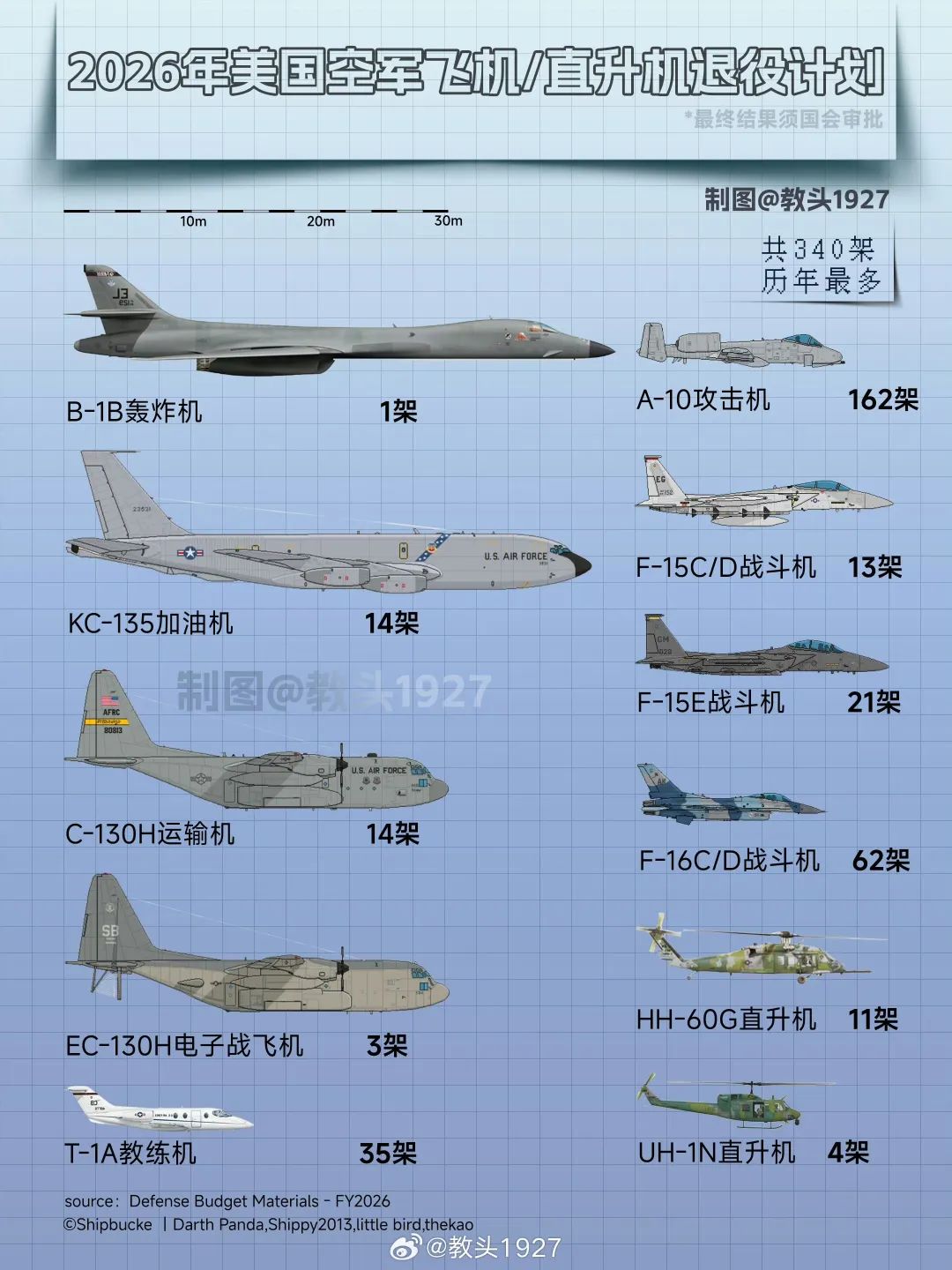 最近,美國空軍發佈了一份2026財年的退役計劃,準備在2026年10月裁減340架現役飛機。