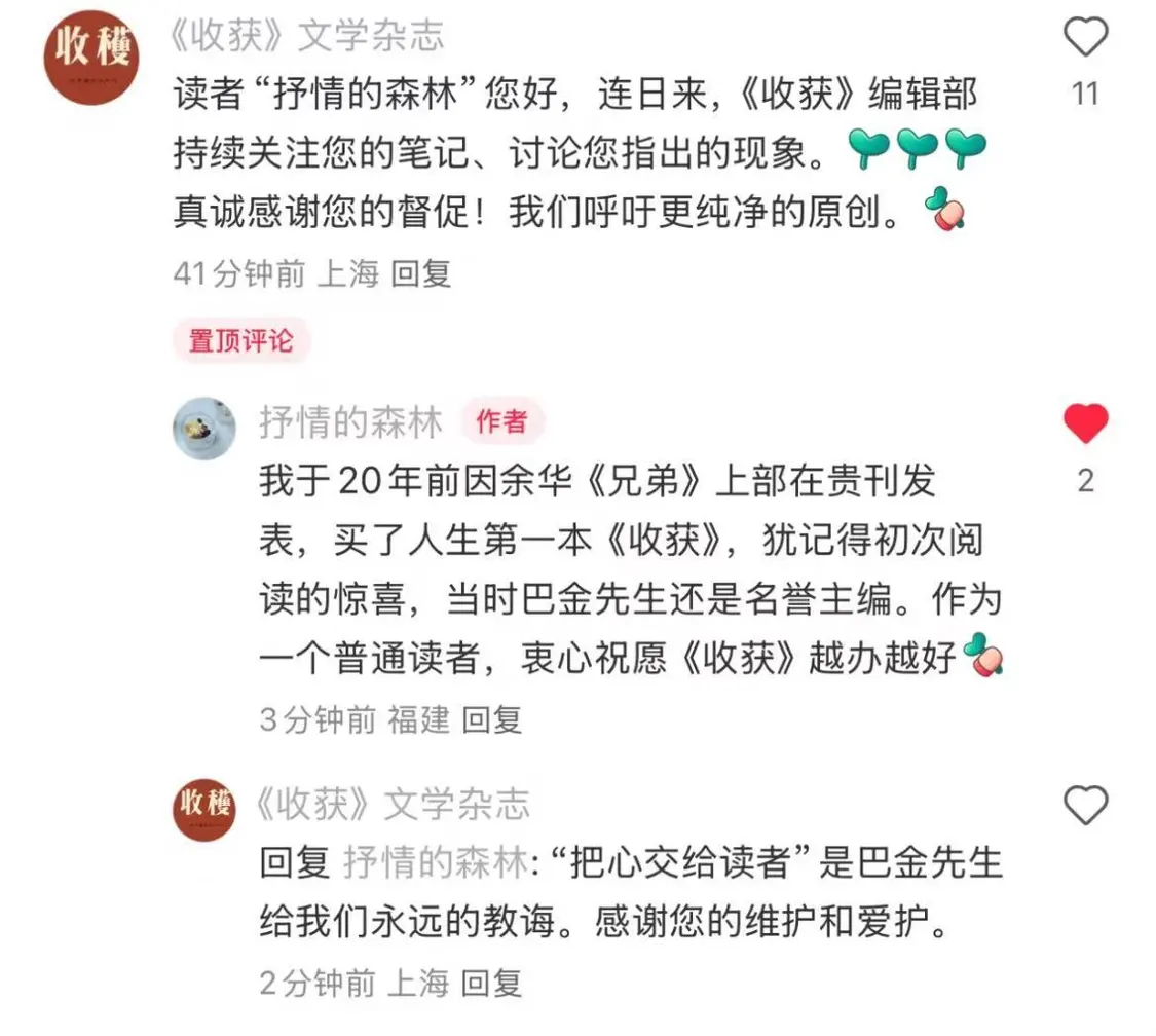 對於《收穫》的回應,“抒情的森林”回覆:“我於20年前因餘華《兄弟》上部在貴刊發表,買了人生第一本《收穫》,猶記得初次閲讀的驚喜,當時巴金先生還是名譽主編。作為一個普通讀者,衷心祝願《收穫》越辦越好。”
