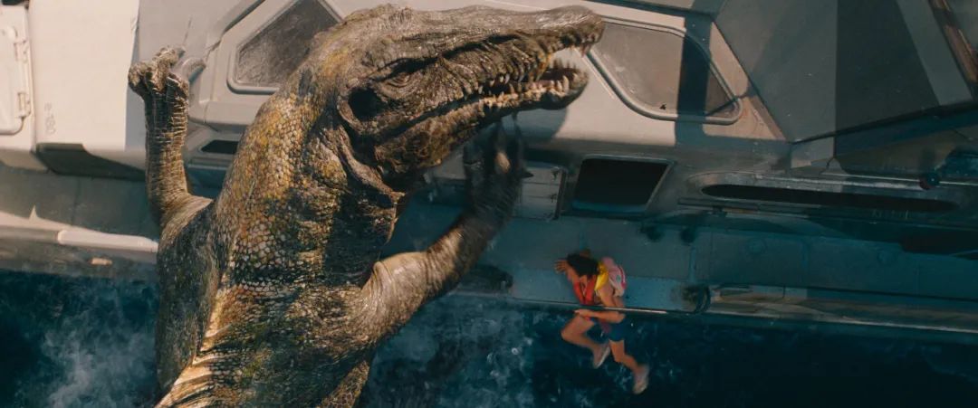 於是這位曾經在《侏羅紀世界》第三部裏硬控霸王龍的狠角色在《侏羅紀世界:重生》裏成了“漁夫”,而且跟滄龍形成了一種共生系統,即棘龍負責狩獵給滄龍吃,問題是棘龍能得到啥?影片沒有交代。