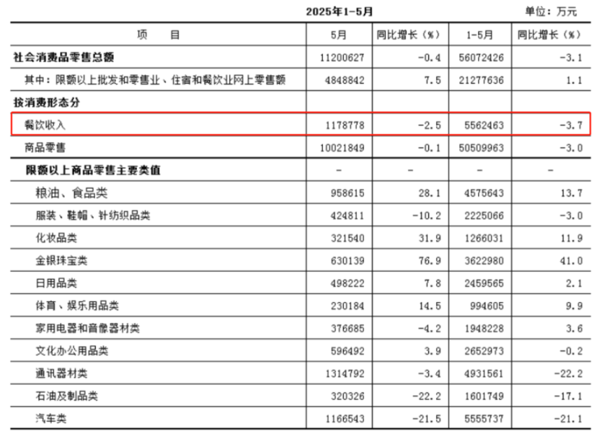 北京統計局數據顯示,2025年1-5月全市餐飲收入556.2億元,同比下滑3.7%;2025年一季度,北京限額以上餐飲企業虧損5219萬元。