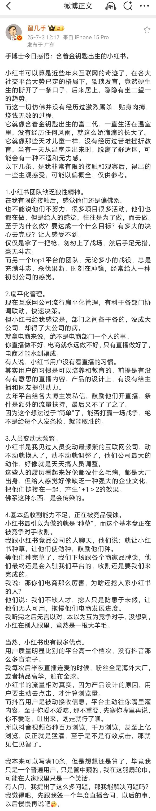 3日中午,留幾手在其社交媒體賬號上發佈了一系列動態,言辭激烈地指責小紅書存在諸多問題。