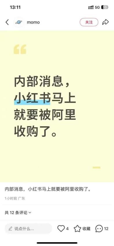 《號外工作室》在社交平台發現,**有網友在小紅書發帖稱,內部消息透露小紅書即將被阿里收購。**這一消息瞬間引發了各界的關注,畢竟小紅書在社交電商領域佔據着重要地位,而阿里作為電商巨頭,若收購小紅書,將對行業格局產生重大影響。