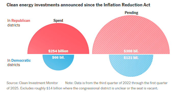 現在很多項目很可能因此被放棄。大部分投資實際上發生在共和黨議員所在的選區,這些地方審批手續通常更簡單,氣候條件也更適合太陽能和風能發電,然而大多數共和黨議員卻最終投票支持。