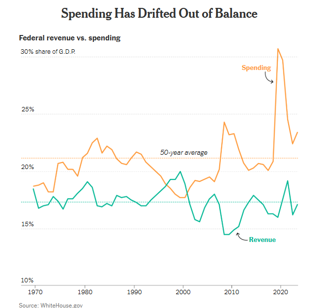 因此帶來的赤字讓經濟處於危險境地。過去50年,聯邦支出佔國內生產總值的比例平均為21.1%。但在新冠疫情期間激增後,支出水平一直頑固地高於這個平均值。由於加税在政治上不可行,這意味着赤字會進一步擴大。