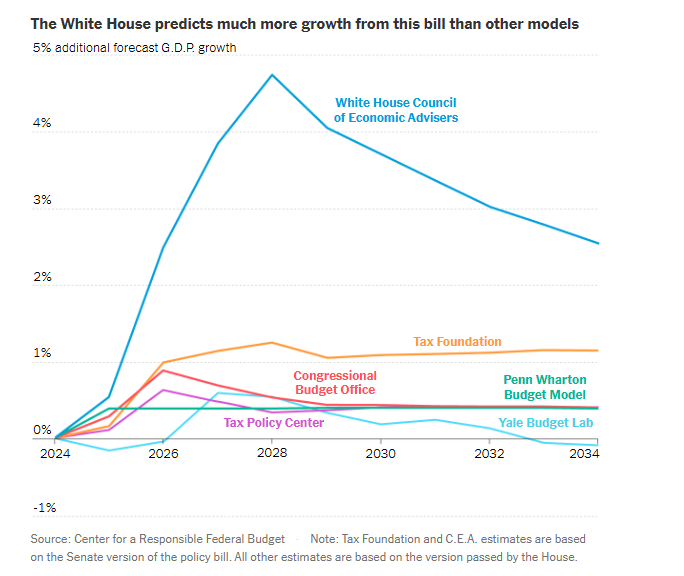 至於這項立法對經濟增長的影響,白宮似乎活在自己的世界裏。私人預測機構普遍預計國內生產總值只會有小幅增長,耶魯大學預算實驗室的預測甚至更低。而白宮經濟顧問委員會卻聲稱,到2028年增長率可能達到4.9%,遠高於其他預測。