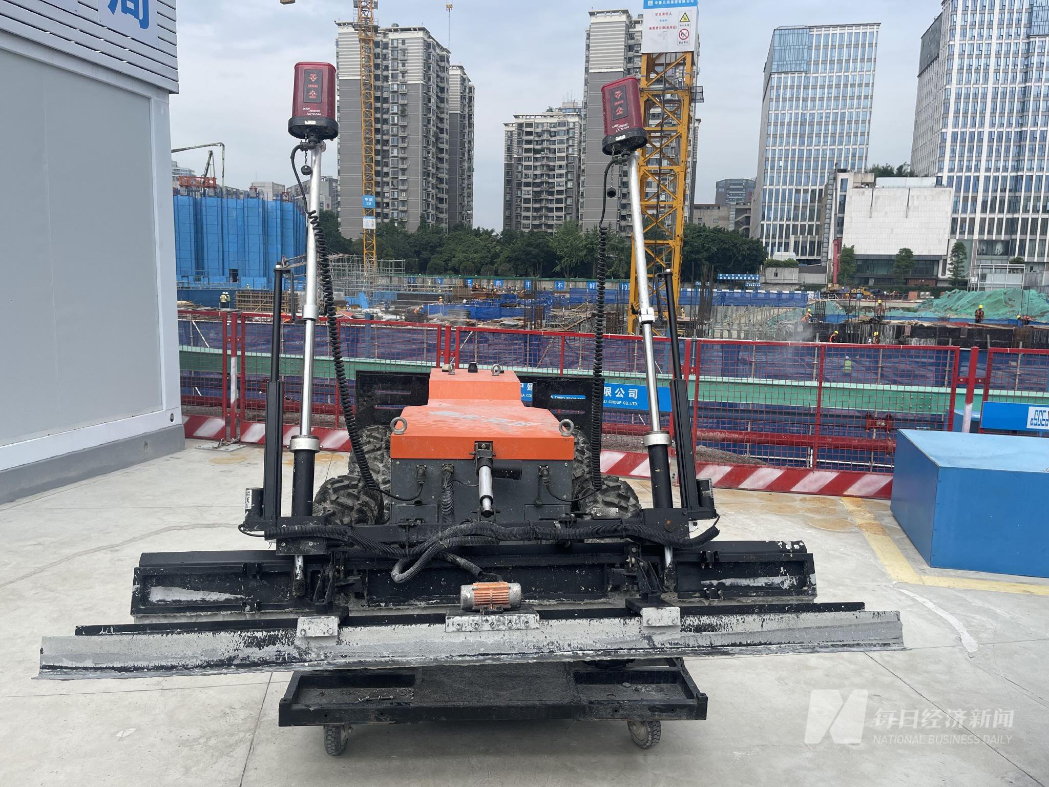激光整平機器人 圖片來源:每經記者 胥帥 攝 四盤抹光機器人則拖着一個大大的抹光盤,在混凝土初凝後抹平地面。