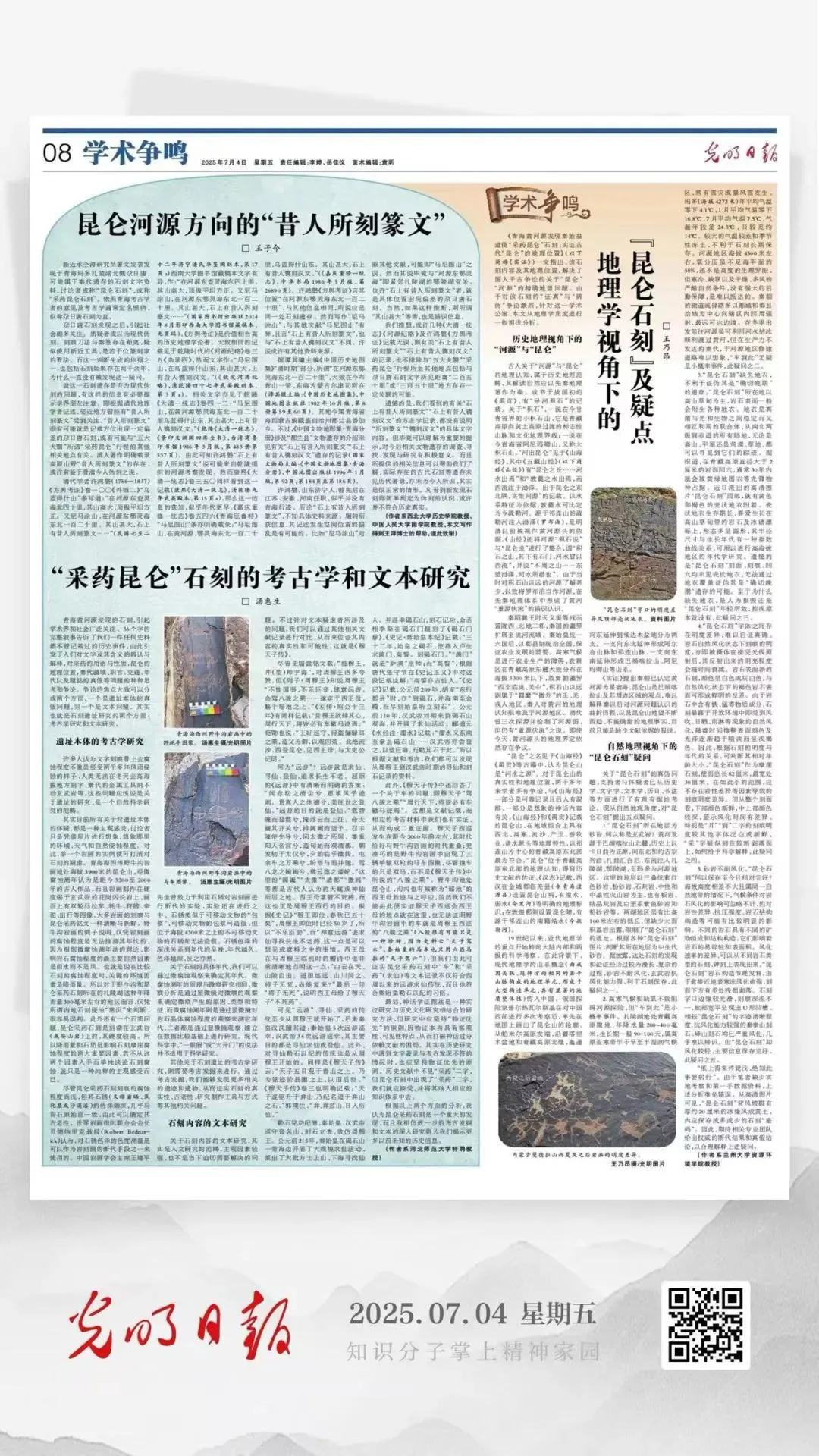 連日來,圍繞“崑崙石刻”真偽,本報陸續收到各界來稿。王子今撰文《崑崙河源方向的“昔人所刻篆文”》,建議石刻應按考古學定名慣例進行命名,並提供了與石刻相關的古代文獻信息;湯惠生撰文《“採藥崑崙”石刻的考古學和文本研究》,將青海巖畫與石刻進行比對,為石刻判定提供了參考;王乃昂撰文《地理學視角下的“崑崙石刻”及疑點》,從自然地理角度指出刻石存在五處疑點。