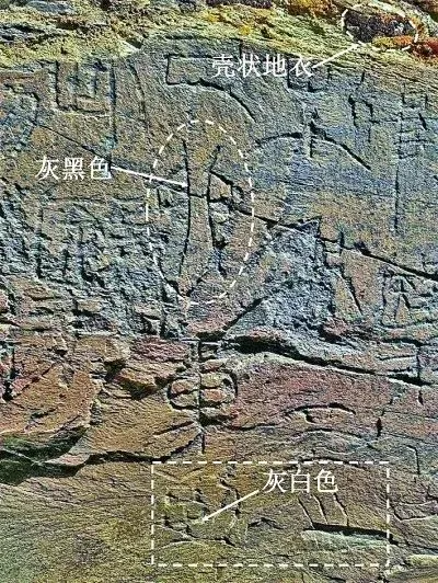 3.“崑崙石刻”缺失地衣,不利於證偽其是“確切晚期”的遺存。“崑崙石刻”所在地以高山草甸為主,岩石表面一般會附生各種地衣。地衣是真菌與光和生物之間穩定而又相互利用的聯合體,從南北兩極到赤道的所有陸地,無論是高山、平原還是荒漠、草地,都可以尋覓到它們的蹤跡。據報道,在青藏高原直徑大於2釐米的巖面凹穴,通常30年內就會被黃綠地圖衣等先鋒物種佔據。近日流出的高清圖片“崑崙石刻”頂部,就有黃色和褐色的殼狀地衣附着。殼狀地衣生存期長,喜愛生長在高山草甸帶的岩石及冰磧漂礫上,形態多呈圓形,其半徑尺寸與生長年代有一種指數曲線關係,可用以進行高海拔地區的年代學研究。遺憾的是“崑崙石刻”刻面、刻痕、凹穴均未見殼狀地衣,無法通過地衣覆蓋證偽其是“確切晚期”遺存的可能。至於為什麼缺失地衣,是人為損毀還是“崑崙石刻”年輕所致,抑或原本就沒有,此疑問之三。