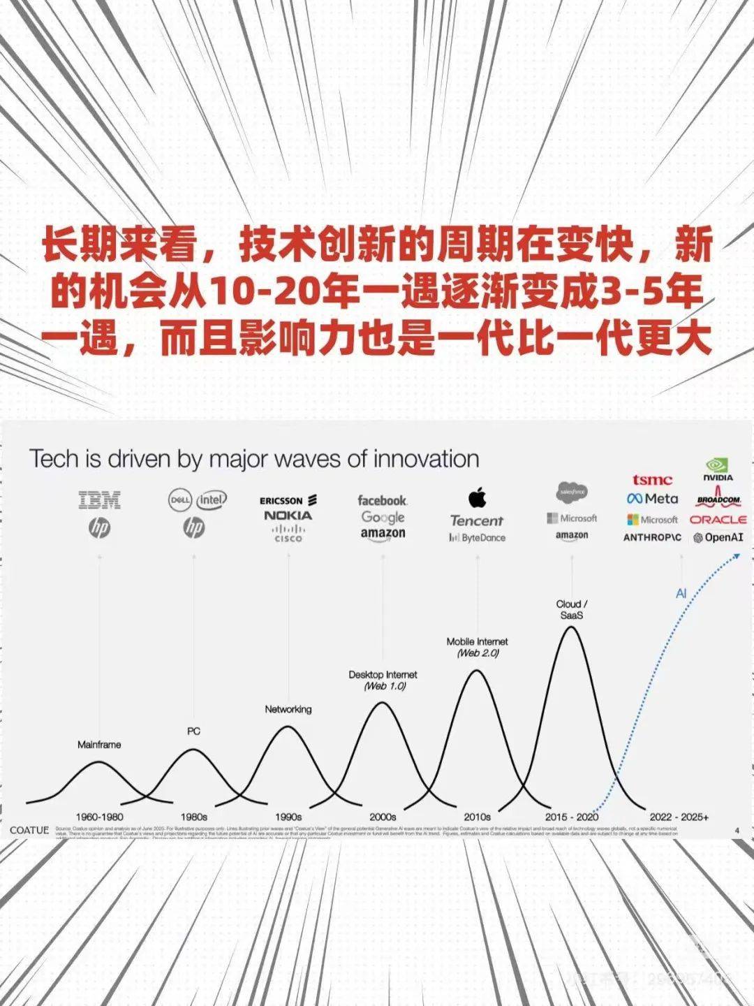 前段時間,對沖基金公司Coatue發佈了每年一度的投資市場報告,總共102頁的PPT,第1頁就開宗明義的畫出了技術創新的週期變化:新的機遇從10-20年一遇逐漸變成3-5年一遇,而且影響力也是一代比一代更大。