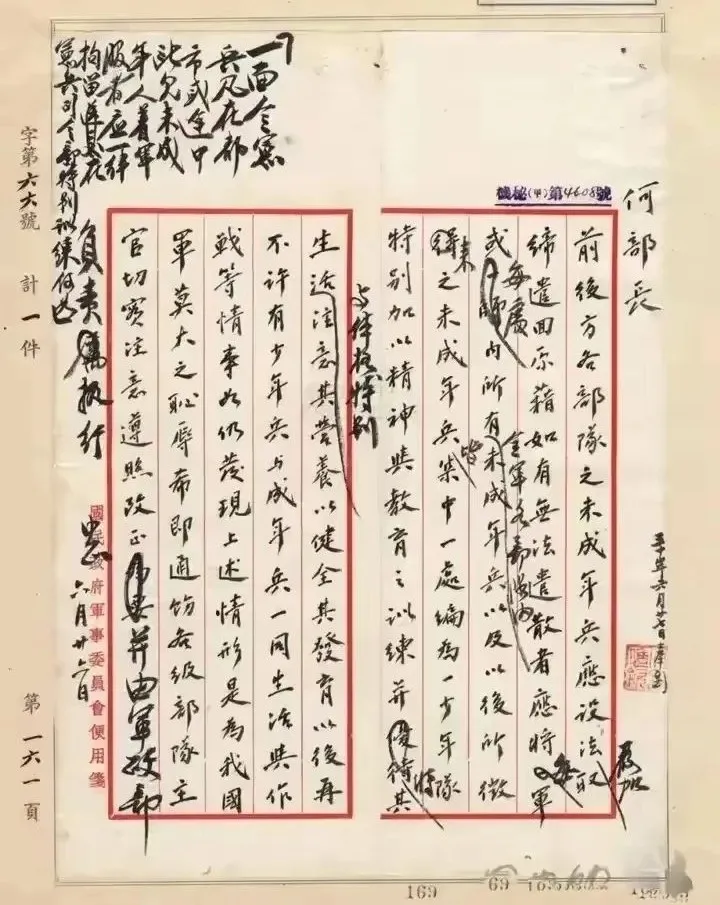 手令一:“何部長 前後方各部隊之未成年兵應設法取締,遣回原籍。如有無法遣返者,應將每軍或每處內所有未成年兵皆集中一處,編為一少年隊,特別加以精神與教育之訓練,並優待其生活,注意其營養,以使健全其發育。不許有少年兵與成年兵一同生活與作戰等情事,如仍發現上述情形為我國軍莫大之恥辱,希即通飭各級部隊主官切實注意遵照改正。”