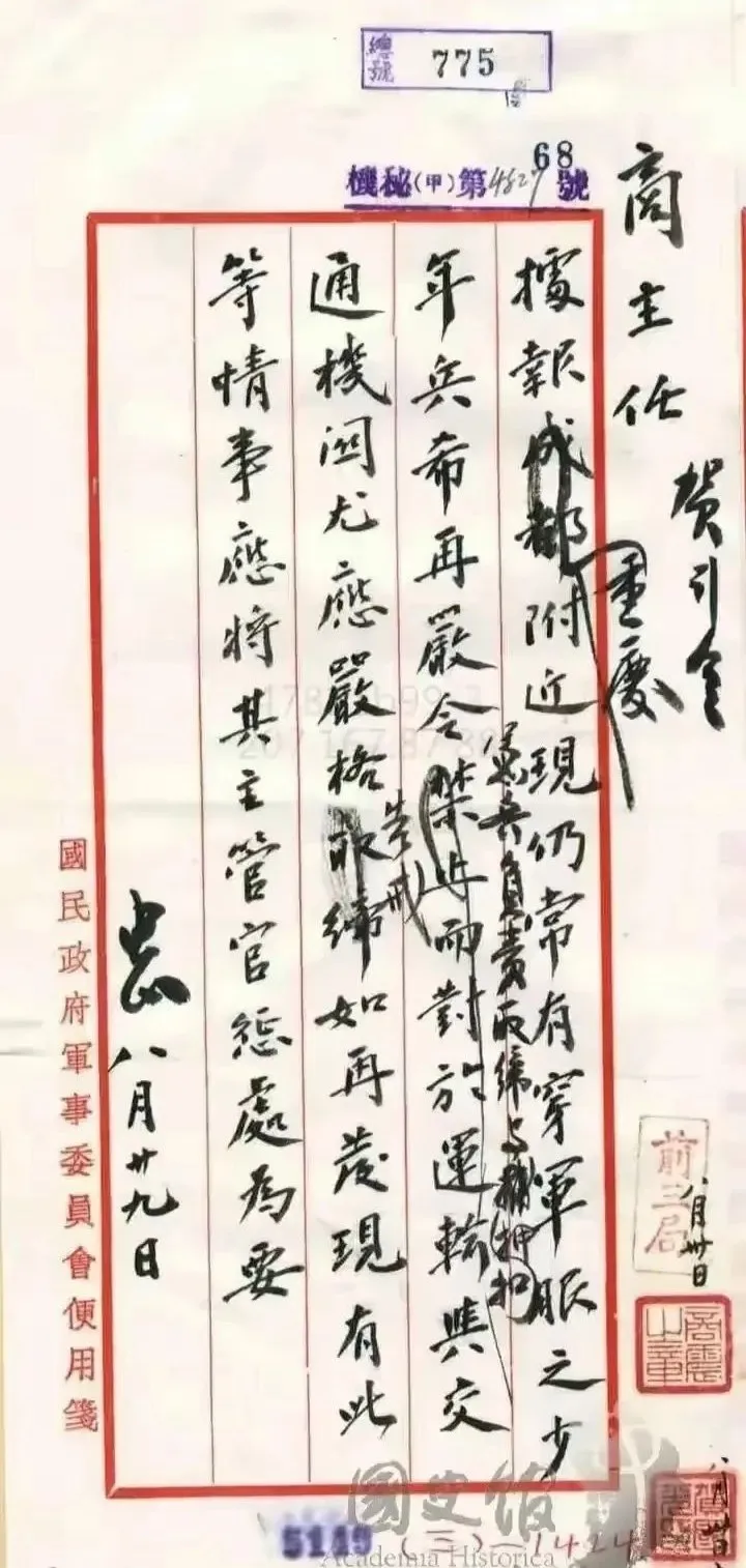 手令二:“商主任 賀司令 據報,重慶附近現仍常有穿軍服之少年兵,希再嚴令憲兵負責取締與扣押,而對於運輸與交通機關尤應嚴格告誡,如再發現有此等情事,應將其主官懲處為要。”